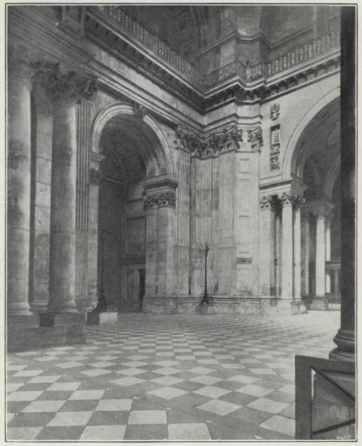 In this Chapel Matins are said at eight o’clock in the morning on all week days throughout the year. In the foreground is the burial place of Dean Milman, marked by a slab with a cross wrought upon its surface. To the west of this, not shown, however, in the view, is the grave of Dr. Liddon. In the Aisles to the right and left are seen a few fragments of monuments from the old Cathedral, scanty relics, spared by the great fire of 1666 and by the ruthless hand of the destroyer.