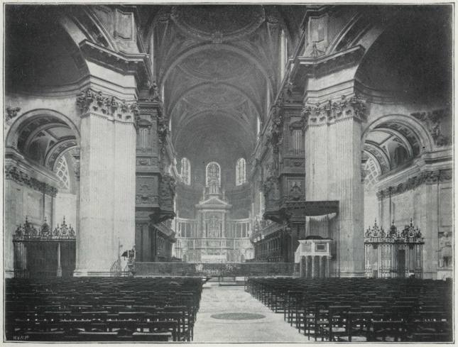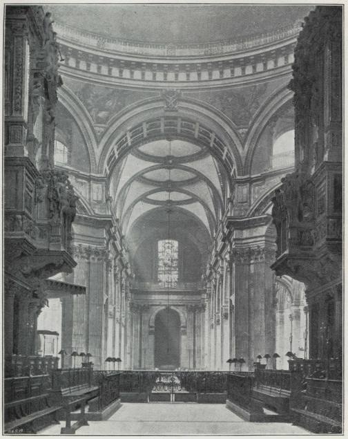 Over the back of the Choir Stalls, which are seen on the left of the picture, rise a few of the pedal pipes of the Organ, the largest of which is thirty-two feet in length. Through the openwork of Tijou’s beautiful iron gates, the view extends across the Dome to the extreme west of the Cathedral. At the end of the North Aisle of the Nave a glimpse is obtained of a window (presented by Mr. H. F. Vernon in 1861) containing a full length figure of S. Paul.