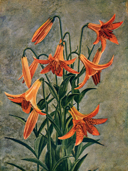 Closely related to the plant of our illustration, and at times closely resembling it, is the beautiful Turk's Cap Lily (Lilium superbum). This species is wonderfully prolific in the production of flowers, sometimes bearing forty or more on a single stalk. It is one of the tallest of the lilies, and frequently the marshes of the eastern states are transformed by its presence into striking masses of color, orange, orange-yellow or red.