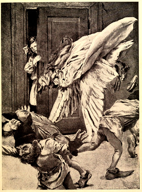 But at this moment the fairy stepped forward from the shadow in which he had been standing. In the dark scullery he seemed to shine with light. "There is no need of that," he cried. "I know you, wicked enchantress; and the net has [171]already been woven that shall break your evil spells."