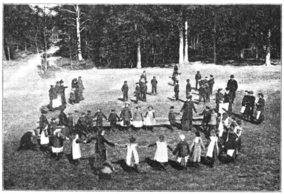 Vår gamla bekanta ångare "Haparanda" förde oss snart bort från stad och vänner ut på det i dag underbart vackra hafvet. Äfven Finlands kust sjönk snart ned bortom vågen, och våra blickar sökte för minnet fotografera och gömma de vackra strandlinjerna af Västerbottens kust och öarna i dess skärgård. Kvällen kom, men sol och ljus dröjde kvar, natten kom, och solen syntes ej vilja gå ned, det var full dag. Klockan var öfver elfva. Jag hade stigit upp på öfversta kommandobryggan. Sju minuter öfver elfva rullade solen ned {285}bortom skogstopparna, men hennes strålar förgyllde himlen rätt i norr, ja, det var som om strålarna tagit i ring och dansat långdans rundt omkring den vida synranden. Ty det var afton- och morgonrodnad på en gång omkring hela himlaranden. Och hvilka färgskiftningar! Nederst violett, så marinblått och öfverst skärt och guld i de mjukaste öfvergångar. Åh, hvilket härligt land vårt Sverige ändå är!