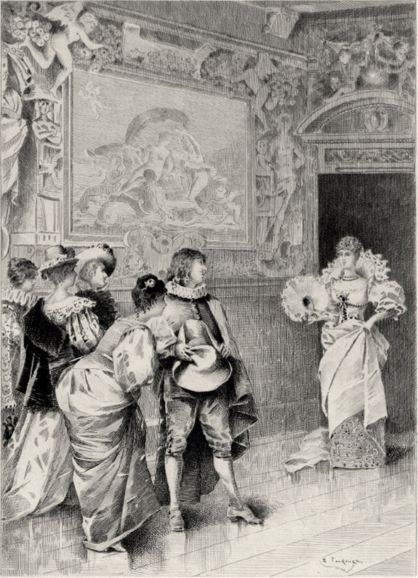 It was Rosalind herself, so fair and radiant that she lighted up the whole room,—with the strings of pearls in her hair, her prismatic dress, her ample lace sleeves, her red-heeled shoes, her lovely peacock's-feather fan,—in a word, just as she was on the day of the play. But there was this important and decisive difference, that she had neither neckerchief nor wimple nor ruff nor anything at all to conceal from his eyes those two charming hostile twin brothers,—who, alas! are only too often inclined to be reconciled.