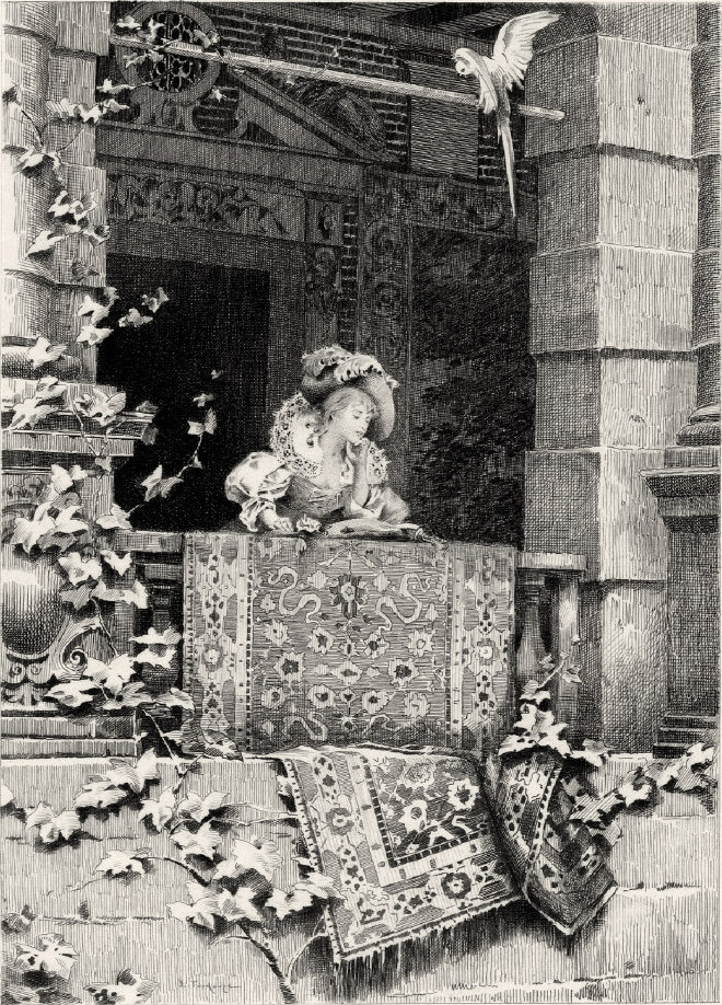 This morning I looked at him for a long while without his seeing me.—I was hidden behind my curtain.—He was at his window which is exactly opposite mine.—This part of the chateau was built toward the close of the reign of Henri IV.; it is half of brick, half of unhewn stone, according to the custom of the time; the window is long and narrow, with stone lintel and a stone balcony.—Théodore—for you have already guessed of course that he is the young man in question—was leaning in a melancholy attitude on the rail, and seemed to be deep in meditation.—Draperies of red damask with large flowers, half drawn aside, fell in broad folds behind him and served as a background.—How beautiful he was, and what a marvellous effect his dark, sallow face produced against the dark red! Two great bunches of hair, black and glossy, like the grape clusters of Erigone of old, fell gracefully along his cheeks and made a charming frame for the pure and delicate oval of his beautiful face. His round, plump neck was entirely bare and he wore a sort of dressing-gown with flowing sleeves not unlike a woman's robe. He held in his hand a yellow tulip, at which he plucked pitilessly in his reverie, throwing the pieces to the wind.