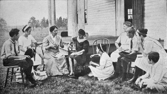 Especially marked is the contrast of the classroom exercises at Fairhope with recitations where, sitting still with their books closed, the children are subject to a fire of questions from28 the teacher to find out how much they remember of a lesson they are supposed to have “studied” alone. To quote again from Rousseau: “He (the teacher) makes a point of showing that no time has been wasted; he provides his pupils with goods that can be readily displayed in the shop windows, accomplishments which can be shown off at will.... If the child is to be examined, he is set to display his wares; he spreads them out; satisfies those who behold them, packs up his bundle, and goes his way. Too many questions are tedious and revolting to most of us and especially to children. After a few minutes their attention flags; they cease to listen to your everlasting questions and they answer at random.” At Fairhope the children do the work, and the teacher is there to help them to know, not to have them give back what they have memorized. Tests are often conducted with books open, since they are not to show the teacher what the child can remember, but rather to discover his progress in ability to use books. Lessons are not assigned, but the books are open in the hands of the pupils and with the teacher they discuss the text, getting out of it all the joy and information possible. This stimulates a real love of books, so that these children who have never been assigned29 a lesson to study, voluntarily study the text after the class work. They are not tempted to cheat, for they are not put in the position of having to show off.