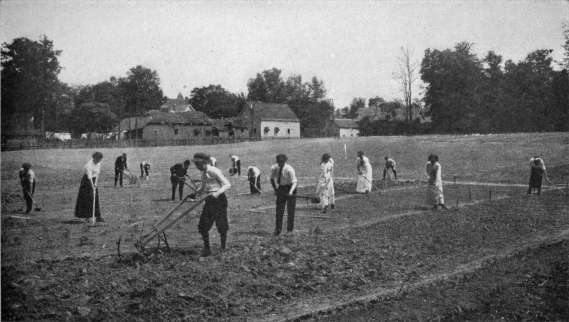 Nature study and field geography are conducted almost entirely out of doors. The children go into the fields and woods and look at the trees and flowers, ask questions about them, examine the differences in bark, leaves, and flowers, tell each other what they think, and use their books to answer questions that the trees and plants have suggested to them. They learn the meaning of the words pistils, stamens, and petals with flowers they have gathered, or watch a bee carrying pollen from plant to plant.32 Individual pupils are encouraged to tell the class what they may have learned at home, to bring flowers from their gardens, or to tell of things they have seen. The class visit a neighboring truck farm, recognize as many vegetables as they can, and learn the names and characteristics of the new ones. When they are back in the schoolroom those that can write make a list of all the vegetables they can remember, thus combining with their nature lesson a lesson in writing. There is a garden in the school grounds where the pupils learn to plow, rake, and plant, watch their seeds come up and grow and flower. In a little plot of ground that is their own, they observe all the phases in the cycle of plant life, and besides get the benefits of the moral training that comes from carrying through a piece of work that lasts several months and demands constant thought and care. This sort of work plays a large part in the curriculum of the younger children, for it seems to belong particularly to their world; to the world of definite concrete objects which they see about them every day, which they can handle and play with, and which consequently arouse their curiosity.