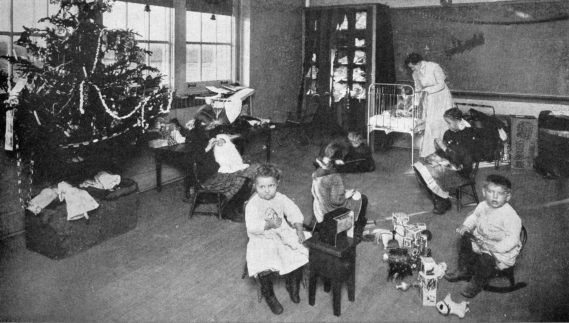 There is also a vacation school during the summer time for the children of the neighborhood, with some classroom work and a great deal of time spent on the playground and in the workshops. The school has an active alumni association which uses the school building for social purposes and keeps track of the pupils that leave. A parents’ club has been started as an aid in gaining the coöperation of the pupils’ parents in the work of the school and as a means of finding out the real needs of the neighborhood. The parents are brought in even closer contact with the school through the series of teas given by the grades for their parents during the year. Each grade serves tea once a year in the domestic science house for the mothers of its pupils. The children do the work for the teas as part of their domestic223 science work, and write the invitations in their English class. The teachers use these teas as an opportunity for visiting the children’s homes and getting acquainted with their mothers. The teacher who knows the home conditions of each child is much better able to adjust the work to the child, being aware of his weak and strong points. To poverty-stricken, overworked mothers these social gatherings come as a real event.