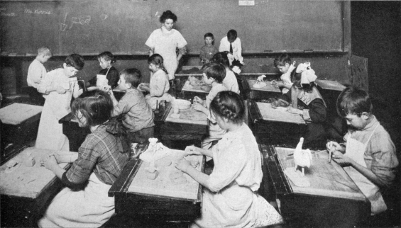 In Gary, the child of the newly arrived immigrant from the agricultural districts of eastern Europe has as much chance to prepare for a vocation, that is really to learn his own capabilities for the environment in which he finds himself, as the child of the educated American. From the time he enters the public school system, whether day nursery, kindergarten, or first grade, he is among people who are interested in making him see things as they are, and in teaching him how to do things. In the nursery he has toys to play with which teach him to control his body; and he learns unconsciously, by being well taken care of, some of the principles of hygiene and right living. In the kindergarten the work to train his growing body to perform useful and accurate motions and coördination goes on. In the first three grades, emphasis is put on teaching him to read and write and obtain a good foundation for the theoretical knowledge which comes from books. His physical growth is taken care of on the playground, where he spends about two hours a day, doing things that develop his whole body in a natural way and playing games that give him opportunity to satisfy his desire to play. At the same258 time he is taking the first steps in a training which is more specifically vocational, in that it deals with the practical bread and butter side of life. He learns to handle the materials which lie at the foundations of civilization in much the same way that primitive people used them, because this way is suited to the degree of skill and understanding he has reached. On a little hand loom he weaves a piece of coarse cloth; with clay he makes dishes or other objects that are familiar to him; with reeds or raffia he makes baskets; and with pencil or paints he draws for the pleasure of making something beautiful; with needle and thread he makes himself a bag or apron. All these activities teach him the first steps in the manufacture of the things which are necessary to our life as we live it. The weaving and sewing show him how our clothing is made; the artistic turn that is given to all this work, through modeling and drawing, teach him that even the simplest things in life can be made beautiful, besides furnishing a necessary method of self-expression.