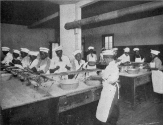 The pupils of the school are given social as well as educational opportunities through their school life. The boys’ club house is opened nearly every night to local boys’ clubs, some of them being school organizations and some independent ones. There are rooms for the boys to hold meetings and to play games, and a well-equipped gymnasium. The teachers of the school take turns supervising these evening gatherings. The attendance is large for the size of the building. Giving the boys a place for wholesome activities has done much to break up the habits of street loafing and the gangs which were so common in the district. The girls of the school use the domestic science house for social purposes. Two chapters of the Camp Fire girls hold regular meetings in the building and get help and advice from the224 teachers. Each domestic science class aims to teach the girls how to live a comfortable and self-respecting life, as well as how to do housework, and so becomes a social center of its own. The girls learn to cook and serve good cheap meals, and then they sit down together and eat what they have cooked. They talk over their individual problems with the teacher and with each other, and give each other much practical help. The domestic science teacher helps the girls who have some skill find work to do after school hours so that they can help their families by helping themselves; she helps the pupils find steady work as they leave school and then keeps track of them, encouraging them to go on fitting themselves for better work.
