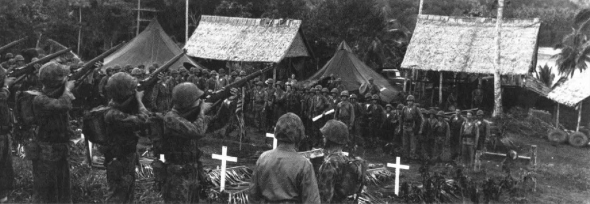 The Central Solomons campaign was launched by the raiders at Viru Harbor before the landings at Rendova and the Dragons Peninsula. A burial detail renders honors to those Marines who were killed in action. The Marines here are clothed in both the familiar sage-green herringbone twill and camouflage utility uniforms which were worn during the campaign by the raiders. The firing squad is armed with Garand M-1 rifles.