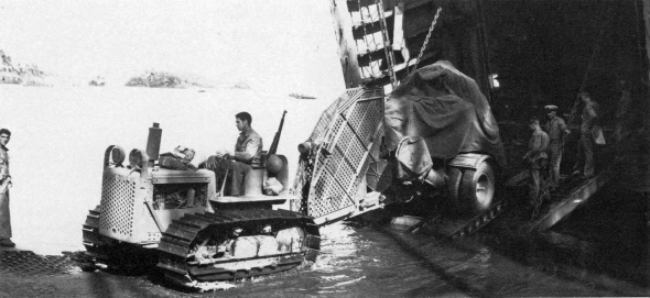 The antiaircraft group of the 9th Defense Battalion moves ashore at Rendova. Here a TD9 tractor pulls a 90mm gun from an LST. The TD9 tractor would soon prove too light to move through the muddy terrain beyond the beach.