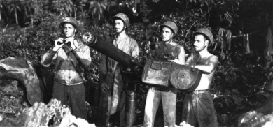 The Northern Landing Group, built around the 1st Marine Raider Regiment, landed at Rice Anchorage on 5 July and proceeded cross-country to take Enogai on Dragons Peninsula. The Marine third from the left hefts a Boys rifle used by the raiders as an antitank weapon.