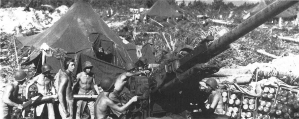 While Marine antiaircraft artillery dealt with air raids, 155mm Long Toms were fired at targets some eight miles or more away round-the-clock, in all weather, taking a toll of the defenders.