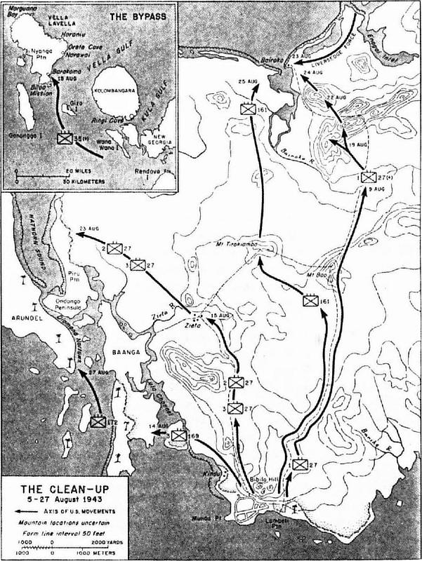 Both on Kokorana and on Rendova, lead elements of the 9th found themselves landing ahead of the assault forces, meeting only light resistance. The battalion band soon took out an enemy machine gun position. Major Robert C. Hiatt’s reconnaissance party from the artillery group killed another enemy soldier, who was said to have been stripped of souvenirs before hitting the ground. The defenders withdrew inland to harass the Americans from the hills and swamps.