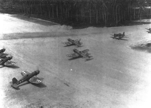 The Vought F4U Corsair, such as these on the Russell Islands, provided much of the air support in the New Georgia campaign. Here they taxi out from revetments onto the air strip to meet Japanese planes coming down The Slot from Bougainville and Rabaul.