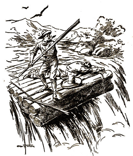 On dashed the Rangers, the hoofs of their mounts thundering like artillery. It was a sight[12] calculated to stir the heart and quicken the pulse of any wholesome, active lad. There were fully twenty of them, riding six abreast. Their sombreros, blue shirts, rough leather chaps and the rifles slung in each man’s saddle holster, showed them to be men of action in the acutest sense of that word; men whose bronzed faces and keen, steady eyes bespoke them of the best type of plainsman; worthy descendants of Fremont, Lewis and Clarke.