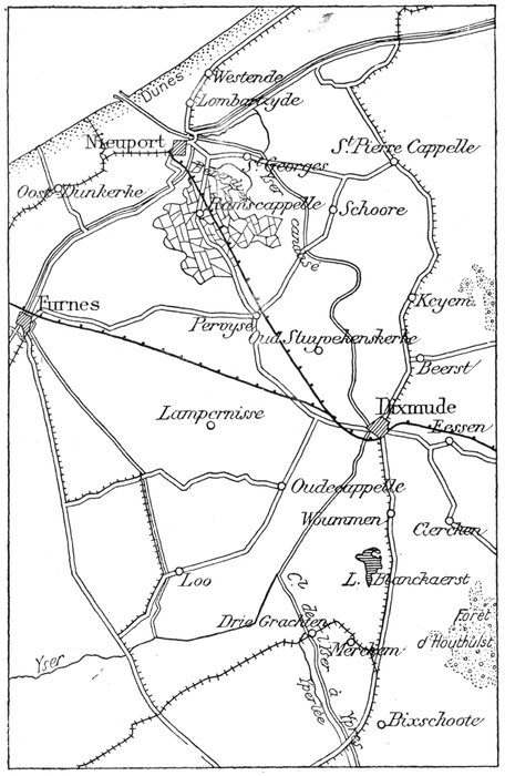 The few roads and the Nieuport-Dixmude railway run along embankments seven to ten feet high.