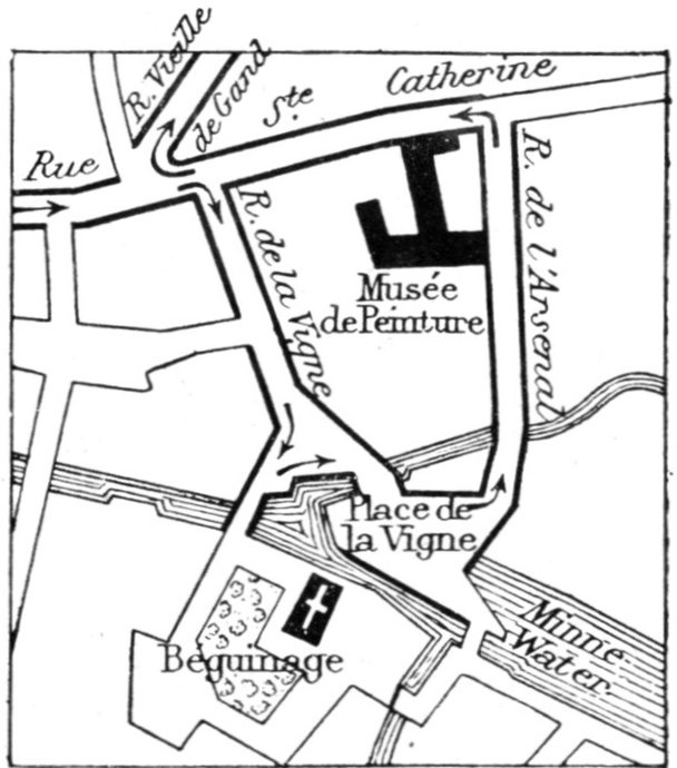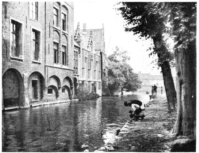 The left-hand road leads to the bridge over the Handzaeme Canal, one of the most picturesque parts of Dixmude. Close by, to the left of the road, stood the Béguinage, comprising some twenty houses grouped around a small chapel, and a fine garden. The place is now overrun with weeds.