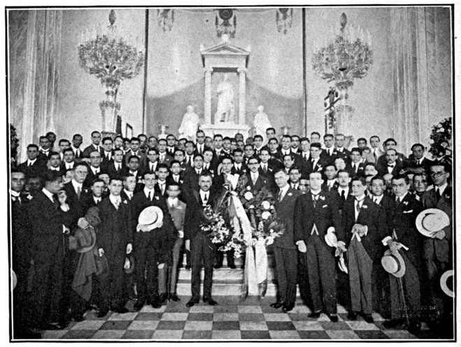A recibirlos al vecino puerto bajaron en automóvil, además de las delegaciones del Ministerio de Relaciones Exteriores y del Consejo Nacional de Instrucción Pública, una comisión especial de la Federación de Estudiantes Venezolanos compuesta por los bachilleres Atilano Carnevali (Presidente de la Asociación), Efraín Cayama Martínez, Miguel Zúñiga, Jacinto Fombona, Rodolfo Moleiro, Germán de las Casas, Gonzalo Carnevali y Eduardo Calcaño hijo. Después del saludo de bienvenida que[Pg 160] se les dió a bordo, los estudiantes americanos fueron invitados por sus compañeros de Venezuela a un almuerzo en Macuto, de donde se dirigieron a Caracas en las últimas horas de la tarde.