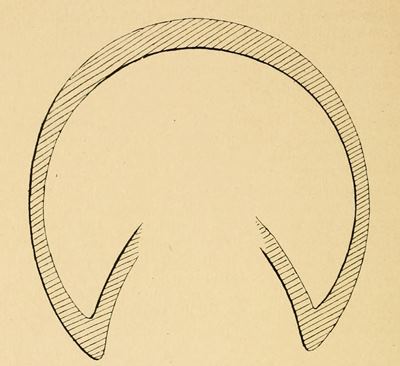 The earliest of these contrivances with which I am acquainted was formed so as to leave the frog uncovered whilst a bearing of rubber was given all round the inner circumference of the shoe. This pad had a wide flat border which fitted under the shoe, with which it was nailed on to the foot. Its great objection was that it could not be nicely fitted on many feet without first cutting away the bars.