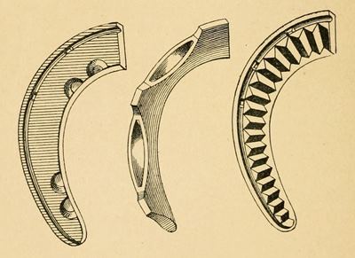 All these pads increase the cost of shoeing but what they save, by preventing falls and injuries to the horse and fear and anxiety to the driver, far more than balances the account in their favour. The cost however is an item, and inventors [Pg 111]have turned their attention to the production of some other methods of applying rubber in connection with the shoe for the prevention of slipping.