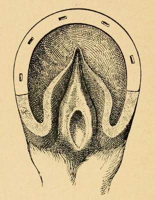 The centre of the frog presents a depression or "cleft" caused by the doubling in of the horn. Few shod feet exhibit it of natural appearance, and the term cleft, by implying a narrow deep fissure, keeps up the false notion. The cleft should be shallow and rounded. It serves two purposes—it increases the mobility of the frog, and by breaking the regularity of surface affords a secure foot-hold on level ground.