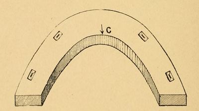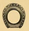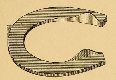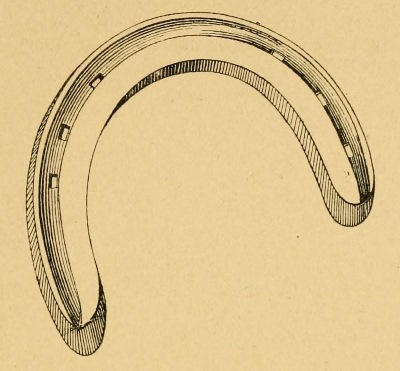 Another plan is to make from rolled bar iron, a hollow shoe, section of which would be U-shaped but level to the foot. Into the groove so formed a thick cord of rubber is placed after the shoe is nailed on the foot. This wears well and affords good foot-hold but it entails the serious objection that the nails are difficult to drive and far from being so safe as in the ordinary shoe. If rubber is ever to be available in a grooved shoe it should be designed so that the nails and nail holes are not interfered with.