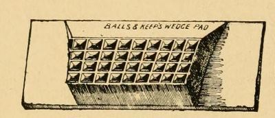 One of the simplest anti-slipping pads is "Balls & Keep's Wedge-pad." It possesses one advantage in not covering up the whole under-surface of the foot. When properly fitted it is firmly retained and does its work, but a careless farrier may so apply it that it shifts on the foot. To fit it exactly[Pg 110] the wall of the back part of the foot must be lowered more than that in front, so that shoe, foot and pad may all be closely adjusted.