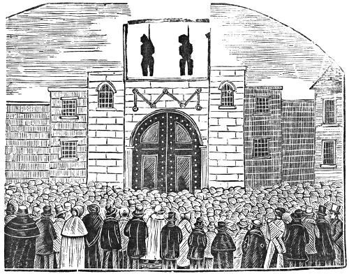 The sheriffs arrived at an early hour, and immediately proceeded to the condemned cell, where they found the prisoner earnestly engaged in his religious duties, with the worthy chaplain of the prison. The time had now arrived for the prisoner to be pinioned, the operation of which was quickly performed, and the wretched man thanked the parson, the governor, and other officials for their kindness towards him. The procession was formed, and slowly took its way to the scene of execution. The cap and rope having been adjusted, the bolt was drawn, and the wretched man soon ceased to exist. Simultaneously with the drop falling, a black flag was hoisted at one corner of the prison, announcing that the last dread sentence of the law had been carried into effect.