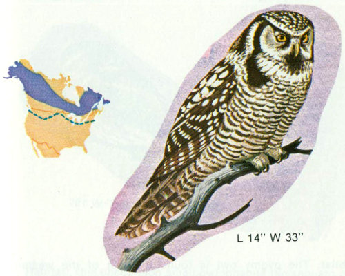 Food: This owl hunts extensively during the day and feeds on small mammals, birds, and insects (Bent 1938). Mendall (1944) examined 21 hawk owl stomachs; all contained meadow or red-backed mice; two owls had also fed on shrews.