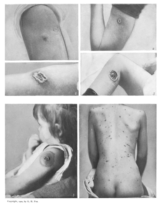 Fig. 1 shows the typical appearance of a successful revaccination. (Fourth day.) [F.] Fig. 4 shows a small, well-formed vaccination pustule at its height. (Eighth day.) [F.] Fig. 2 shows a large, irregular pustule resulting from scarification of an area of unnecessary extent. (Eighth day.) [F.] Fig. 5 shows an ulcer resulting from infection of the vaccination lesion. [F.] Fig. 3 shows a primary vaccination at its height (eighth day) with a characteristic areola. [F.] Fig. 6, a case of Varicella on the third day. [F.]