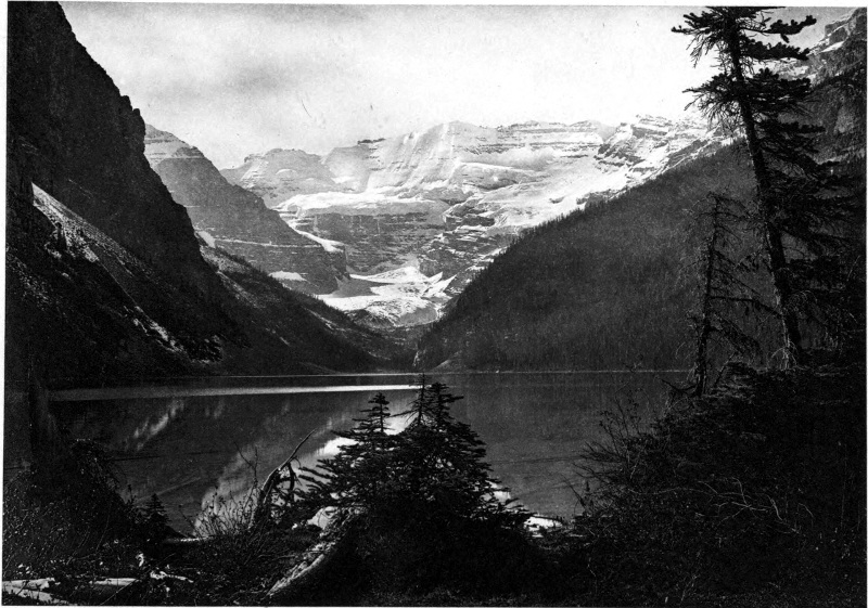 The last visit I made to Lake Louise was toward the middle of October, 1895. A very snowy, disagreeable September had been followed by a long period of milder weather with much bright sunshine. The new snow, which had been quite deep near the lake, had altogether disappeared except high up on the mountain side. It was the true Indian summer, a season with a certain mellow charm peculiar to it alone, characterized by clear 30 sunny weather, a calm atmosphere, a low, riding sun, and short days. Most of the flowers were withered. The deciduous bushes, lately brilliant from frost, were rapidly losing their foliage, and the larches were decked in pale yellow, far up near the tree line. However, the greater part of the vegetation is evergreen, and the spruces, balsams, and pines, the heaths, ericaceous plants, and the mosses contrive to set winter at nought by wearing the garb of a perpetual summer in a region where snow covers the ground three fourths of the year.