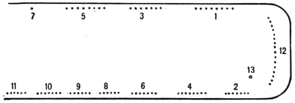 Fig. 1.—Diagram showing places of gentes in the lodge. 1. Ṭsi´-zhu Wa-shta-ge; 2. Wa-ṭse-tsi Wa-shta-ge; 3. Ṭsi´-zhu Wa-noⁿ; 4. Hoⁿ´-ga A-hiu-ṭoⁿ; 5. Mi-k’iⁿ´ Wa-noⁿ; 6. Wa-ça´-be; 7. Tho´-xe; 8. O´poⁿ; 9. Ho´ I-ni-ḳa-shi-ga; 10. Wa-zha´-zhe çka; 11. Ṭa´ I-ni-ḳa-shi-ga; 12. Iⁿ-gthoⁿ´-ga; 13. Sho´-ḳa