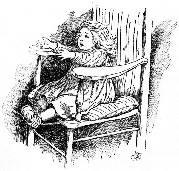 Phronsie lifted her head and looked at her. “I’ll have the wet stuff on, Polly, and sit in the chair,” she said, with a long sigh; “lift me back, Polly, do; then you can bake Mamsie’s cake.”