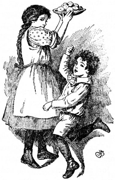 So Phronsie was lifted back with great ado,[14] Polly kissing her many times, and telling her how glad she would be on the morrow when Mamsie’s birthday cake would be a beautiful success, and how happy Mamsie would be to know that Phronsie helped to bake it by being such a good girl. And the little toes were wet with the wormwood, and tied up in an old cloth; and Grandma Bascom, dropping the tin cup which she was bearing back to the stove, with a clatter on the floor, created such a diversion as Polly and the boys ran to get cloths and spoons to save the precious wormwood and wipe the floor clean, that the little old kitchen rang with the noise, and it was some time before Polly could get it quieted down again.