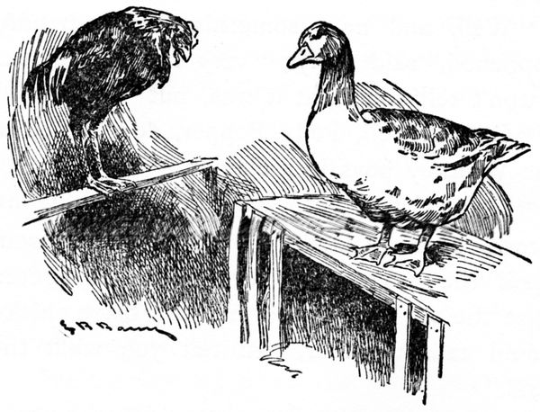 “Now for the white chicken!” he cried, drawing a long breath, and perching on the end of the baking-table.