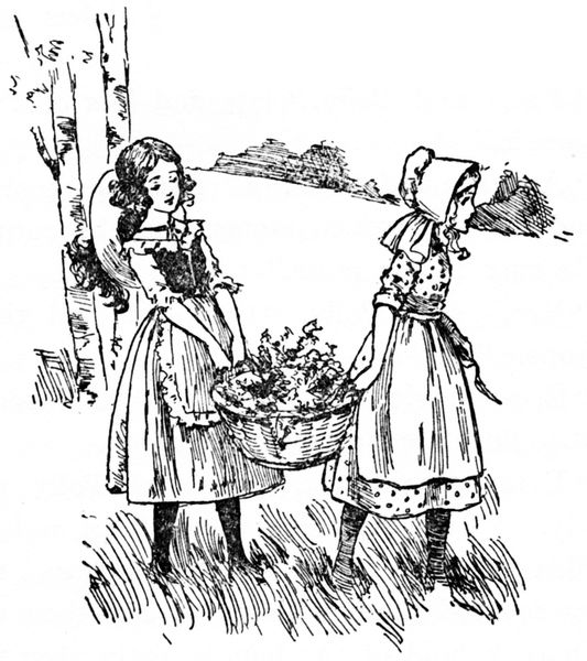 “Well, now, Joe,” said Jasper, “if you don’t keep quiet, we sha’n’t get any further in this story than that table;” which had the effect of sending Joel into his seat as quickly as he had jumped off. And Polly began again before he had a chance to speak. “And there on the top of the table was a big bunch of flowers; we had a tea-cup that Mamsie had given us, because it was cracked and the handle was gone, and Ben had put some of the flowers he brought from the woods into it; but the rest he made up into little bunches, and laid one on every little stone seat; for I forgot to tell you, the boys had brought five little stones, one for each of us, so we could always have our chairs ready for us, you know.”