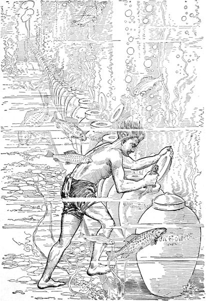 Nun kam sie an einen Bach und setzte sich auf einen Grashalm am Ufer. Ein Fisch schwamm heran, und als sie ihn erblickte, begann sie zu singen: