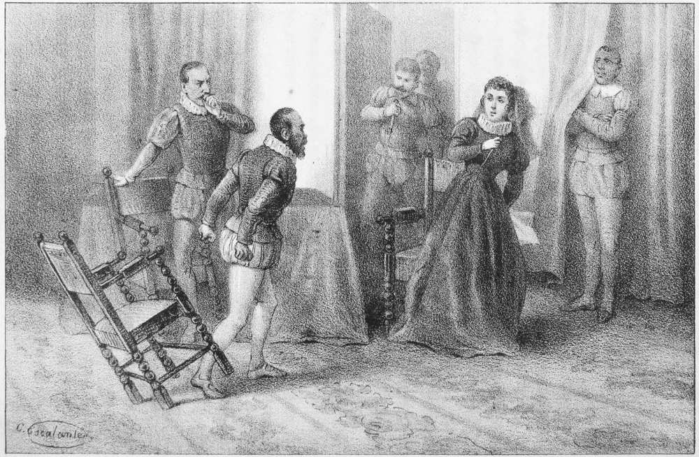 De repente, en el silencio de la noche, se oyó el ruido de un gran cerrojo, y poco despues la puerta principal del palacio del arzobispo, se abrió dando paso á una extraña comitiva.