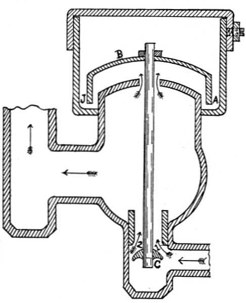 When the gas pressure becomes too heavy it raises the float B, which sets in mercury at point J and A, and closes the valve C, points 1 and 2.