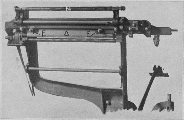 Now, with machine in position (Fig. 6), put on face plate N (Fig. 7), which is held by the three cap screws 2, 3 and 4 (Fig. 6), and magazine A and flexible front and glass C (Fig. 7) and connect spaceband lever, spaceband transfer carriage, distributer shifter carriages, line delivery carriage, assembling elevator, etc. Reversing these directions will, of course, show how to take the machine apart.