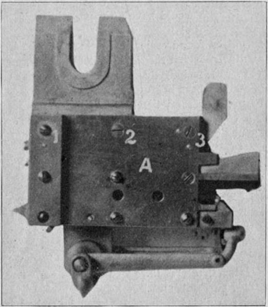 The assembler slide brake H and spring L should be adjusted to prevent the assembler slide from jumping ahead to the left or continually vibrating as the matrices enter. If the assembler vibrates it makes it impossible for the operator to read the line, and the last letter will sometimes fall out when the assembling elevator is raised. This is caused by the brake H wearing at points 3 and 4, which lessens the tension of the spring L and takes up the space between bottom screw J and brake lever K at point 6, which should be about 1-32 inch. If brake H is not too badly worn at points 3 and 4 this trouble can be obviated by strengthening spring L[38] and turning up screw J until you have about 1-32 inch space at point 6. Be careful not to get too much space at point 6, or the assembler slide would not return when the line has been released from the assembling elevator.