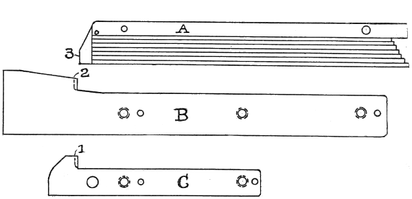 Then put on keyboard C (Fig. 6) and put in rods B (Fig. 6), which are numbered consecutively, beginning with No. 1 at the left. Then put on first elevator A (Fig. 6), distributer N (Fig. 5), and belt P (Fig. 5), which should always be crossed so as to run away from the gears.