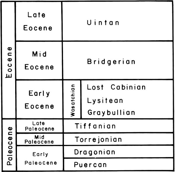 Mammals from the Wasatch Formation in Fossil Basin represent the Greybullian and Lysitean provincial ages (see Fig. 6). These fossils are of earliest Eocene and mid to early Eocene age. Fossil localities in the Wasatch Formation of southwestern Wyoming are Knight Station (partly Lysitean), at Elk Mountain (Greybullian), and at Fossil Butte itself. The age of the Wasatch Formation at Fossil Butte is Lysitean.