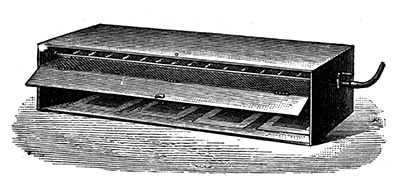The Drying Box is of great importance to the successful working of the process. The opinions of the various practitioners with regard to the temperature at which the drying of the plates should be effected differ as widely as upon the advisability or29 otherwise of admitting a current of air through the box during the operation. The drying should be completed as rapidly as possible from the commencement of the operation, care being taken that the heat never exceeds 50°C. Many plate-makers simply dry the plates in an open apartment—of course, only illuminated by a non-actinic light—simply placing the plates on a horizontal surface, which may be maintained at the temperature indicated by a water bath, a lithographic stone, or merely a cast-iron plate arranged in a suitable manner for heating from below. This method of drying is open to many objections: the surface of the plate is seldom free from dust, and the gelatine coating is too liable to irregularities from draughts admitted to the apartment during the process. They are more frequently dried in specially-constructed boxes provided with screws for accurately levelling the plates, and through which only a small circulation of air takes place. These boxes are usually rectangular in shape, the upright sides being of wood and the bottom of sheet iron. The lid is an open framework covered with a close orange or black cotton material, the whole standing upon four iron legs over a spirit or gas flame. In the upper part of the box a thermometer is fixed, about the centre of either the side or lid, in such a position that it may be readily observed without the necessity of opening the box. Strong horizontal iron bars are placed across at about the centre, and are provided with30 thumbscrews, upon which may be placed a plate of glass bearing a circular spirit level, by which means the plates may be levelled with the greatest accuracy. The sheet-iron bottom of the box being heated unevenly, it becomes necessary to mitigate this inconvenience as far as possible, which is easily done by covering the plate to a depth of about half-an-inch with dry river sand, over which should be placed tissue paper to keep down any possible dust.