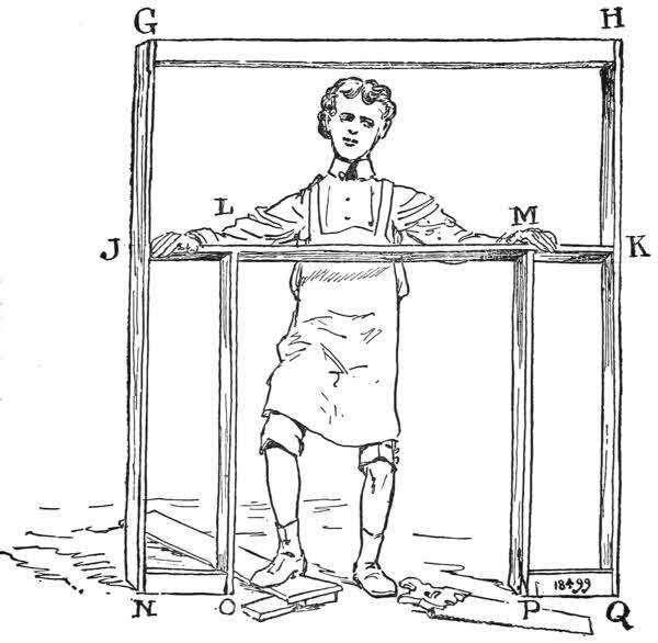 of about the proportions of Fig. 298, and make a frame of four sticks for the back of the box; notch the cross-sticks (Fig. 299) so that they will fit flush, or even, with the inside surface of the two long pieces (Fig. 300).