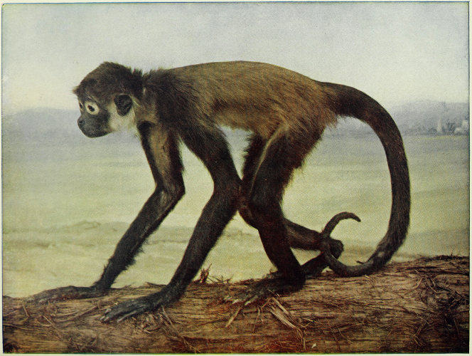 Happiest when permitted to hang on the tree boughs, she would drink from the overhanging branches without touching the ground. In fact she was only perfectly at home when climbing around the trees, as she was comparatively awkward when on the ground, walking on all fours in a somewhat clumsy manner. Like all Spider Monkeys, she was of a gentle, teachable disposition, for all South American monkeys lack many of the mischievous and disagreeable traits of their African cousins, though as a rule they are not as bright and vivid in color and are duller and more indolent in their nature.