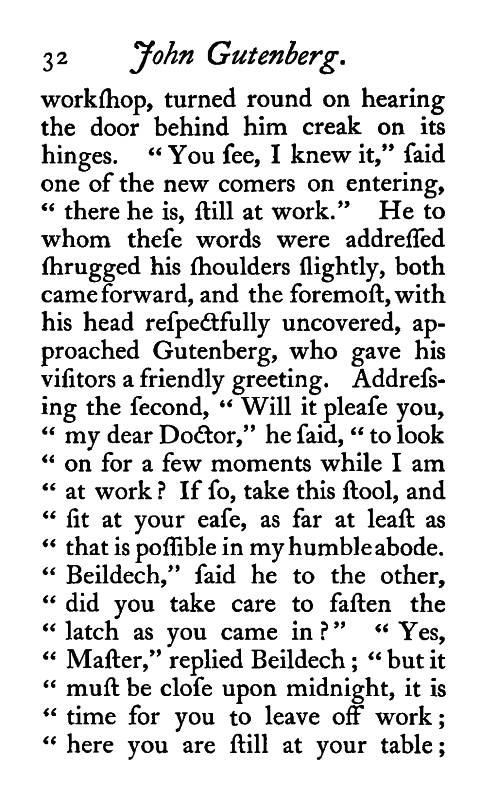 A smoky lamp hung from the beam which divided the ceiling of29 the room into two equal parts, and shed its feeble light on the table where John Gutenberg was working. But beware, reader, of representing this table to yourself as furnished with any of those perfect instruments which are the improvements of modern days; with a case for the letters, a visorium, a composing-stick, a galley, or a catch; it was nothing more than a great oaken board, on which his letters were placed in little woollen bags, ranged in alphabetical order; the form in which they were to be disposed was in front of the artist, and at his side, on a desk, roughly put together, reposed the heavy in-folio which he used as a manuscript. Let the compositor of the present day, who complains, often justly, of the illegible copy of the poet or the philosopher, compare humbly his task with that of his great predecessor! He was obliged first to select30 from his bags, to place the letters with great delicacy, to turn back to the manuscript in order to read it, and to recommence his labour incessantly until one whole line, laboriously put together, had been ranged along a string; if at this point his negligence, as a compositor, had permitted one fault, he must needs unfasten the string, and recommence his work from the beginning!