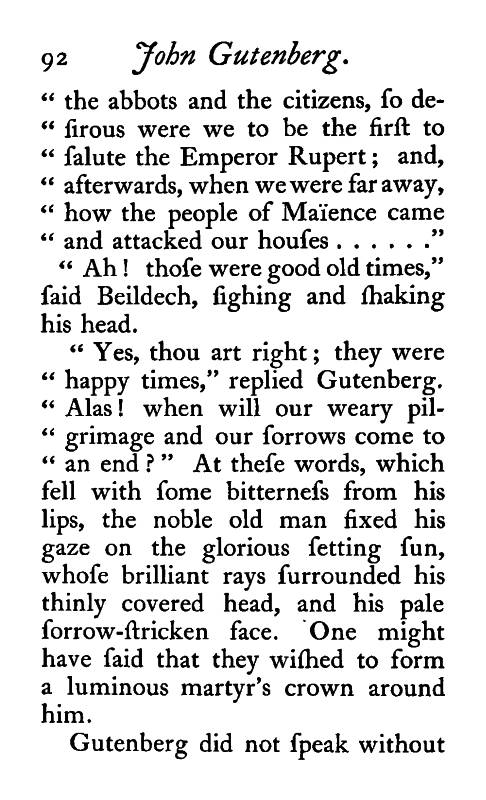 What a caravan, and what a journey; and what thoughts must have passed through the mind of the chief actor and guide when he reflected, especially on that first occasion of his flight in this very same91 direction—a flight then resembling that of an eagle soaring from its nest! Beildech carefully avoided every word which might recal those days to his Master; but one evening when our travellers had halted on a hill overlooking the Rhine, Gutenberg broke the general silence by saying, with much sadness, “Dost thou recollect, my good Beildech, how in the year —20 we travelled this road together? I proudly on horseback, a boasting young aristocrat, just like all the rest, thinking myself quite equal to the Furstenberg, the Volksberg, the Gelthuss, the Humbert, canst thou not see me now with my fine floating feather fastened to my velvet cap, and my slashed doublet covered with an abundance of ribbon? Ah, Lawrence, how handsome it was! and how merrily we passed by on the road heavily mounted cavaliers sent by92 the abbots and the citizens, so desirous were we to be the first to salute the Emperor Rupert; and, afterwards, when we were far away, how the people of Maïence came and attacked our houses....”