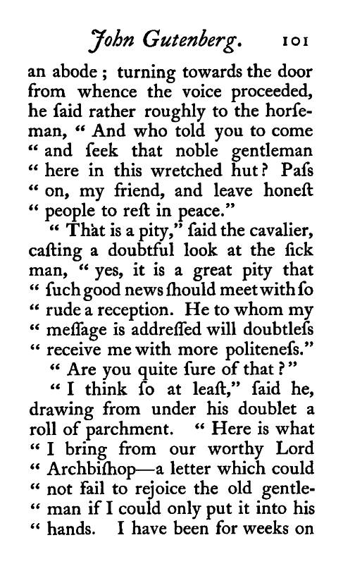 The horseman bent his tall figure as he entered the low door of the dwelling. “He whom I seek,” said he to Beildech, who advanced gloomily, “is called John Gutenberg, and he is from Maïence.”
