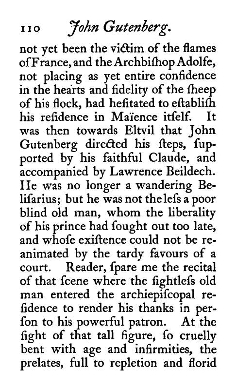 * I will not, says the author of the Death of Gutenberg, let the authority for the blindness of my hero rest on fiction alone. My readers will permit me to cite the testimony of a man who was contemporary with Gutenberg, Wimphelin of Schlestadt, who at the age of fifteen came to Strasburg, in the year 1465. He says distinctly, in speaking of Gutenberg, in his catalogue of the Bishops of Strasburg written in 1508: “ductu cujusdam Johannis Gensfleisch, ex senio cæci.”
